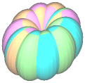 $$\begin{aligned} x &= \frac{1}{2}\cos{\phi}\cdot\left(\cos{\frac{n}{d}\phi}+f(\phi)\sin{\theta}\right) \\[5pt] y &= \frac{1}{2}\sin{\phi}\cdot\left(\cos{\frac{n}{d}\phi}+f(\phi)\sin{\theta}\right) \\[5pt] z &= \frac{1}{2}\cdot\left(p+f(\phi)\cos{\theta}\right)\\[5pt] &f(\phi)=\sqrt{p^2+\cos^2{\frac{n}{d}\phi}}\\[5pt] &\phi\in[0,2d\pi],\quad \theta\in[0,2\pi]\end{aligned}$$Na 2D slici je prikazano kako su pojedini dijelovi plohe povezani s parametrizacijom. Boja pojedinog pravokutnika odgovara dominantnoj boji pojedinog dijela plohe. Pogledajte članak za više matematičkih detalja.